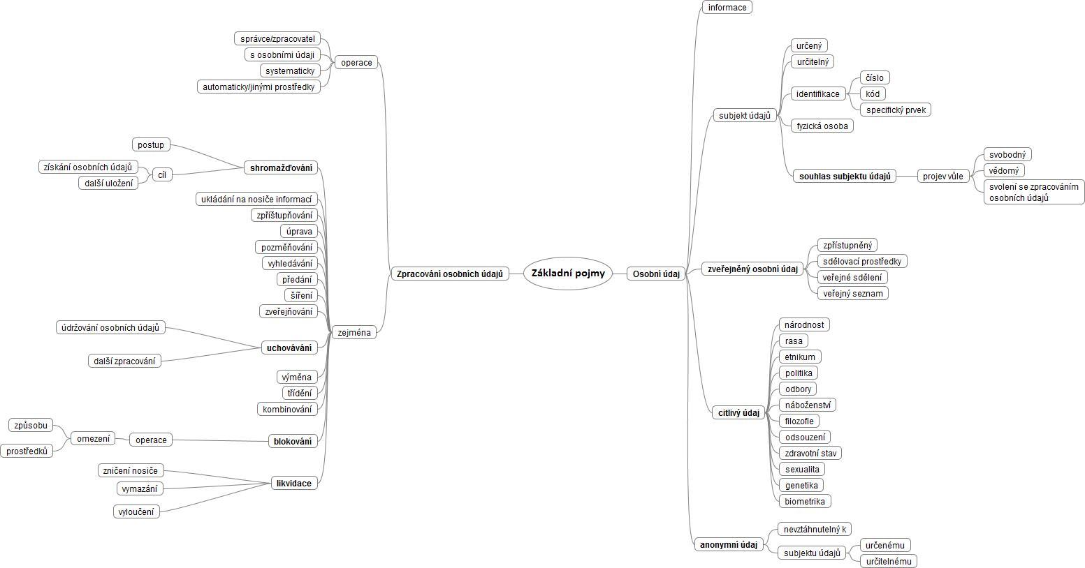 Osobním údajem se rozumí jakákoliv informace týkající se určeného nebo určitelného subjektu údajů. Subjekt údajů se považuje za určený nebo určitelný, jestliže lze subjekt údajů přímo či nepřímo identifikovat zejména na základě čísla, kódu nebo jednoho či více prvků specifických pro jeho fyzickou, fyziologickou, psychickou, ekonomickou, kulturní nebo sociální identitu. Mezi typickými příklady osobních údajů lze uvést jméno a příjmení, rodné číslo, adresu bydliště, rodinný stav apod. Subjektem údajů je fyzická osoba, k níž se osobní údaje vztahují. Zveřejněným osobním údajem je osobní údaj zpřístupněný zejména hromadnými sdělovacími prostředky, jiným veřejným sdělením nebo jako součást veřejného seznamu. Souhlasem subjektu údajů je svobodný a vědomý projev vůle subjektu údajů, jehož obsahem je svolení subjektu údajů se zpracováním osobních údajů.